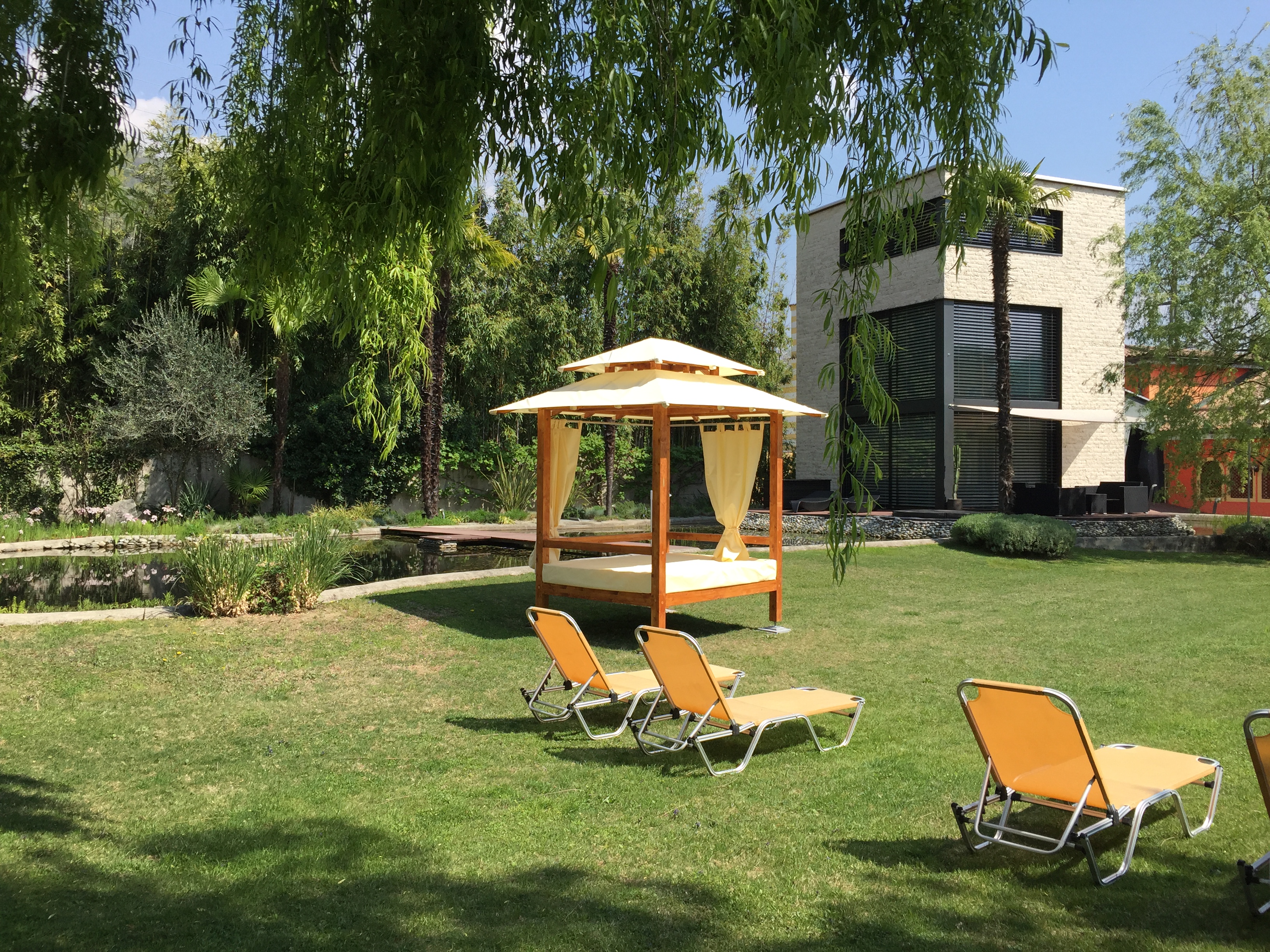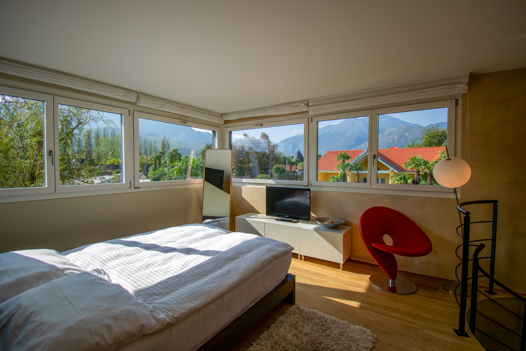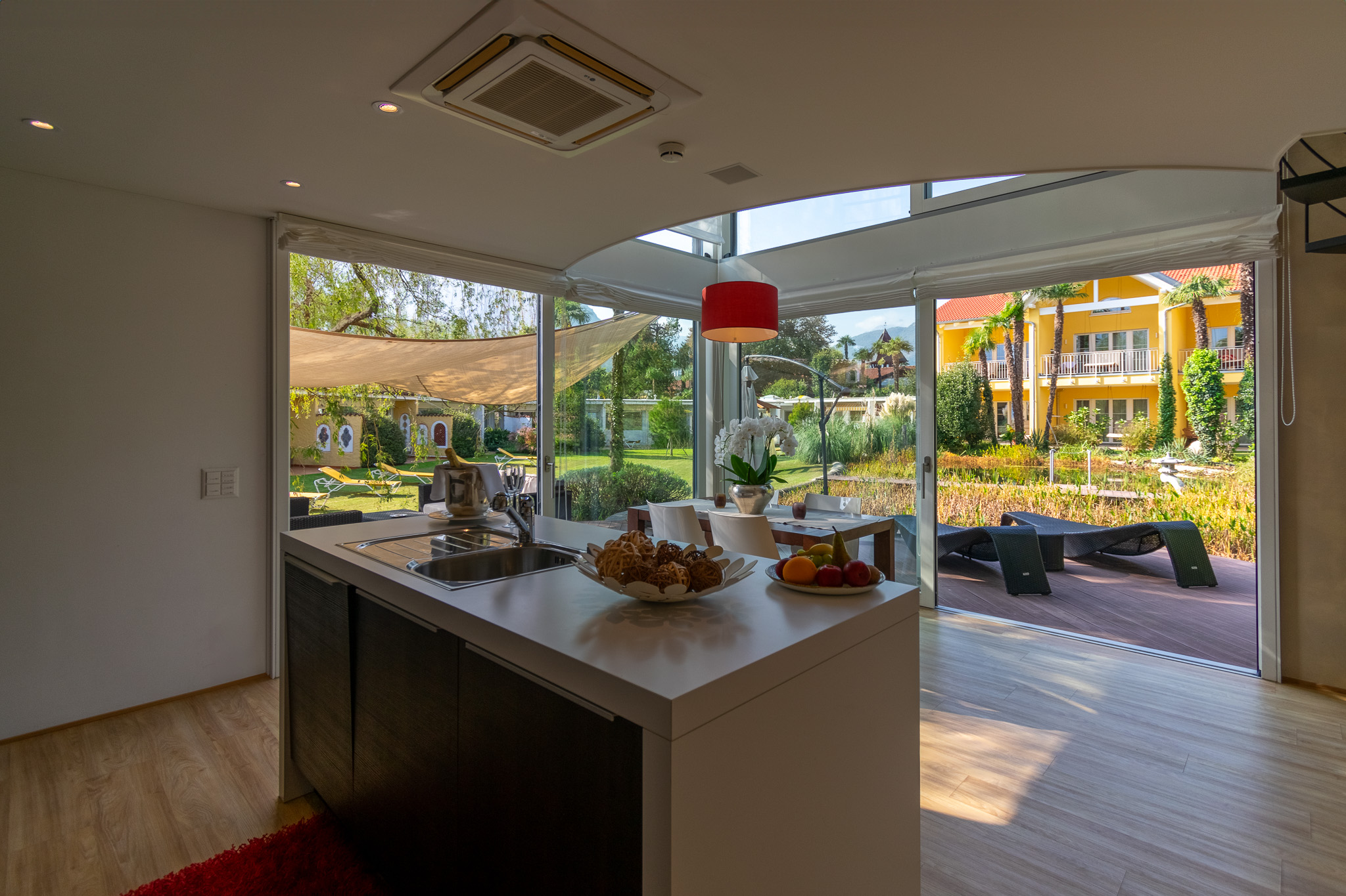 Three-story presidential suite: first floor with terrace and hot tub with kitchen, second floor with living room, and third floor with bedroom.