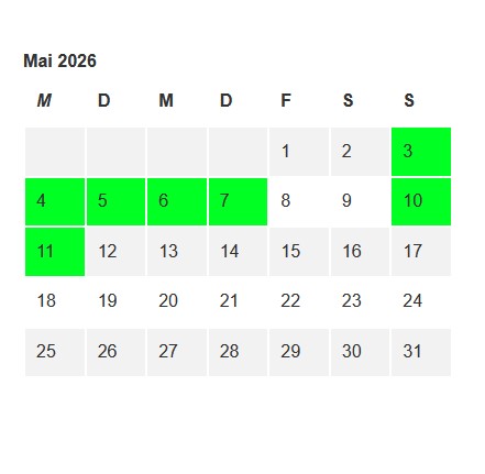 L'offre est valable les jours marqués en vert (rouge = l'hôtel est fermée) et peut être renouvelée plusieurs fois jusqu'à épuisement des points accumulés.