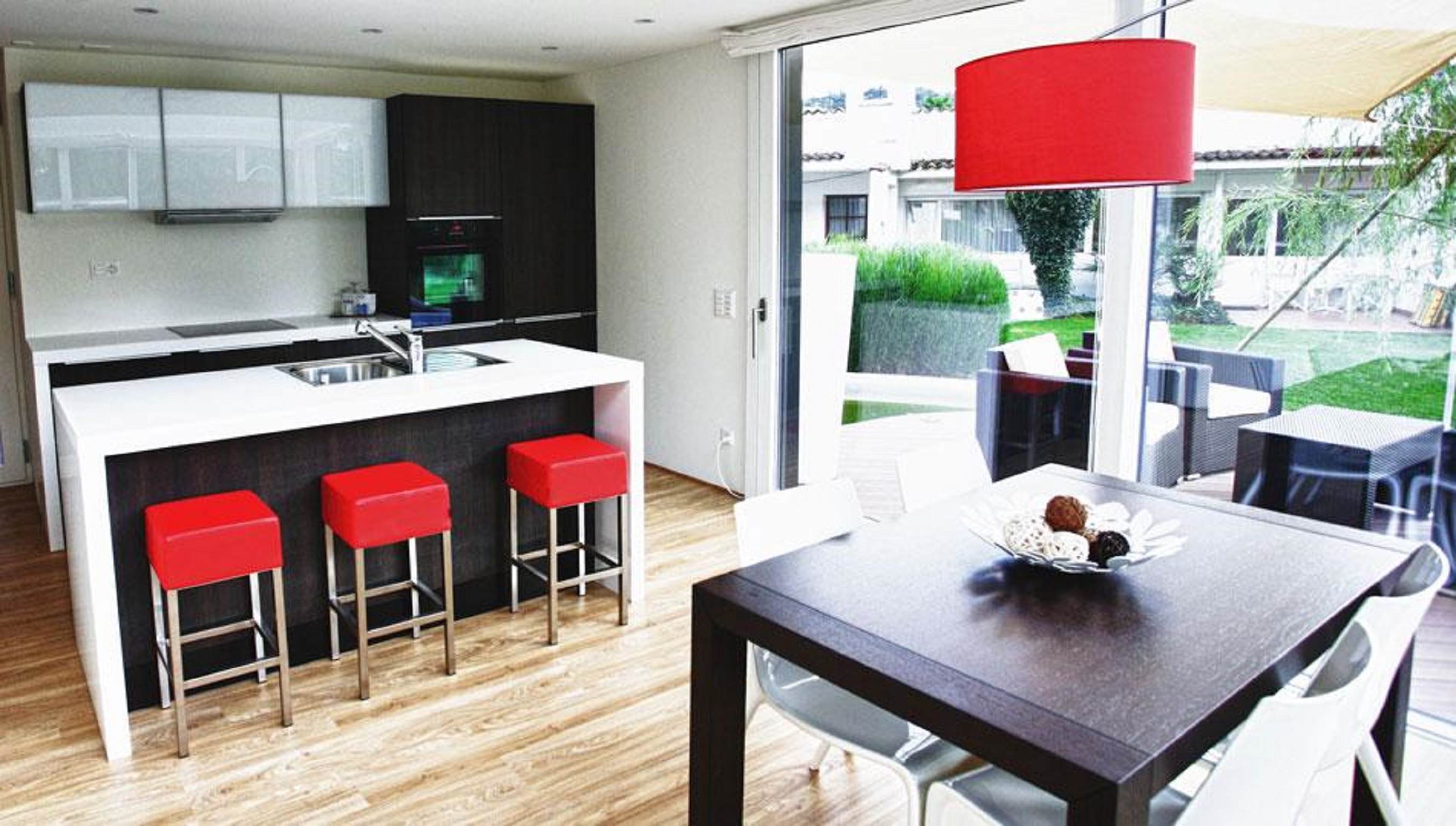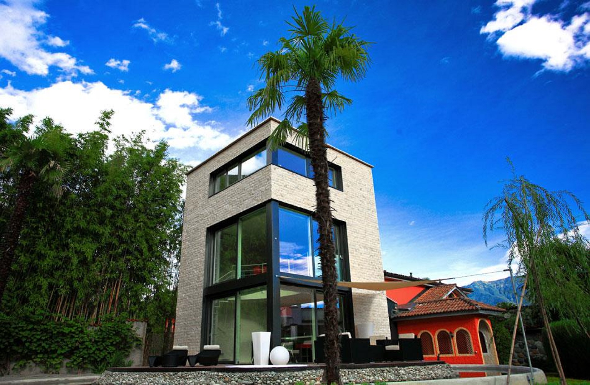 Suite présidentielle sur trois étages : premier étage avec terrasse et jacuzzi avec cuisine, deuxième étage avec salon et troisième étage avec chambre à coucher.